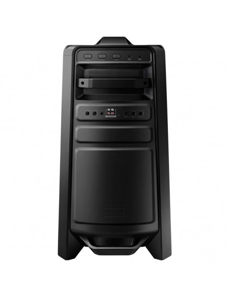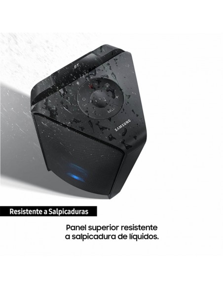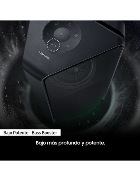 Ponte en modo fiesta Aumenta el volumen de tu fiesta con un sonido bidireccional y una increíble potencia de salida de 1500 vatios. Sonido bidireccional Disfruta de una experiencia de sonido bidireccional para que escuches con la misma potencia desde cualquier ángulo. Potenciador de bajos Mejora la calidad de sonido pulsando el botón de potenciador de bajos para que puedas escuchar los bajos más potentes. Siente los bajos Bajo integrado Bajo de 10 pulgadas para ofrecer un sonido más profundo y potente, de modo que no solo lo oirás, sino que también lo sentirás. Comienza la fiesta Luces LED para fiesta Samsung Torres de Sonido ofrece una variedad de divertidos modos de luces, incluido el modo Fiesta, Ambiente, Danza, Trueno, Estrella y Amor. Además, gracias a la aplicación, podrás ajustar los efectos fácilmente desde tu dispositivo móvil. Configura el efecto de luces para que combine con el ritmo y… ¡que comience la fiesta! * Imágenes simuladas solo con fines ilustrativos. Conviértete en la estrella de la fiesta Modo Karaoke Conecta el micrófono, reproduce tu música favorita y diviértete cantando. El escenario estará listo y el ritmo bajará para que comience la fiesta. *Se permite la conexión de hasta 10 dispositivos (compatibilidad inalámbrica). *En la conexión inalámbrica, la calidad de sonido puede ser inestable según el entorno de Bluetooth. Diseño resistente a salpicaduras Los dispositivos Torres de Sonido cuentan con un panel superior resistente al agua, por lo que no deberás preocuparte por las salpicaduras accidentales de agua. ¡Simplemente disfruta de la fiesta! * Imágenes simuladas solo con fines ilustrativos. ** No se garantiza en todas las situaciones.
