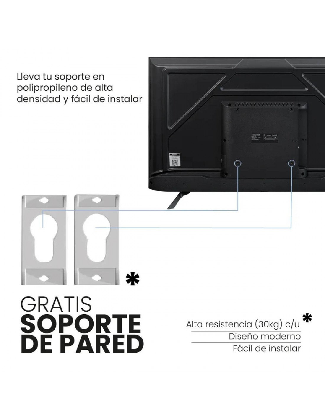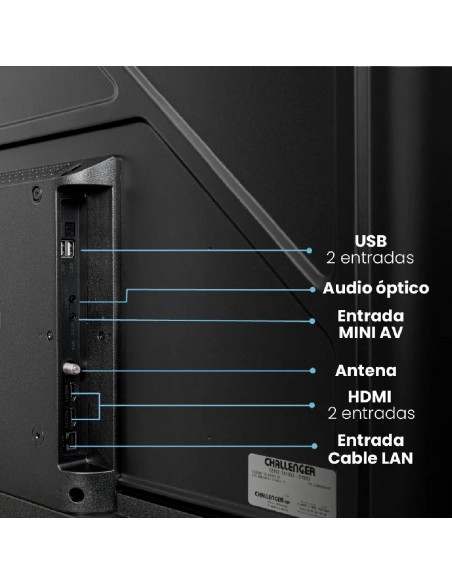 - 2 Entradas HDMI (ARC/CEC) / HDMI1 ARC - 1 Conector RF de 75 Ohm.(Antena/Cable) - 2 Entradas de USB.(Foto, Musica, Video) - 1 Entrada de video compuesto 3.5 mm mini AV - 1 Entrada RJ45 (Ethernet)