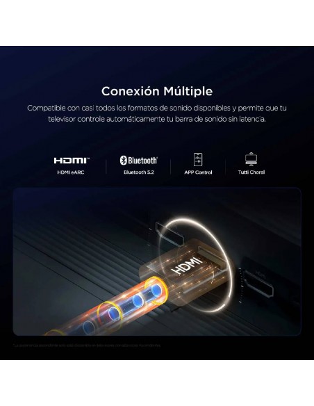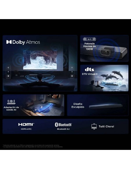 - Sistema de Bajos Dual - Cámaras de Eco de Doble Bocina - Tutti Choral - DTS Virtual:X - Calibración de sonido óptima - Modos de sonido especializados - Sonido Adaptativo con IA - HDMI 2.0 con eARC