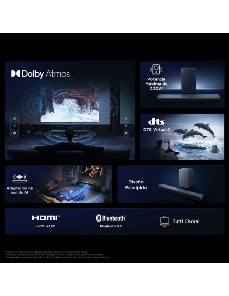 - Sistema de Bajos Dual - Cámaras de Eco de Doble Bocina - Subwoofer Inalámbrico - Tutti Choral - Dolby Atmos - DTS Virtual:X - Calibración de sonido óptima - Modos de sonido especializados - Sonido Adaptativo con IA - HDMI 2.0 con Earc