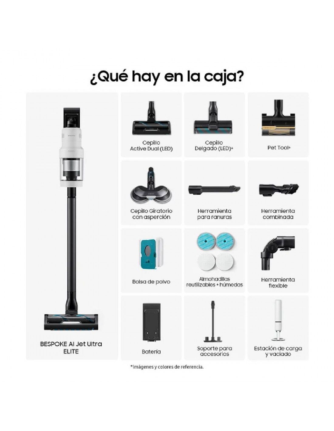 - Modo limpieza AI 2.0 (con cepillo doble activo) - Modo de limpieza AI 2.0 (Con cepillo Slim LED +) - Sistema de filtración HEPA - Smarthings - Bolsa de 2 lts de capacidad - Batería - Inalámbrica