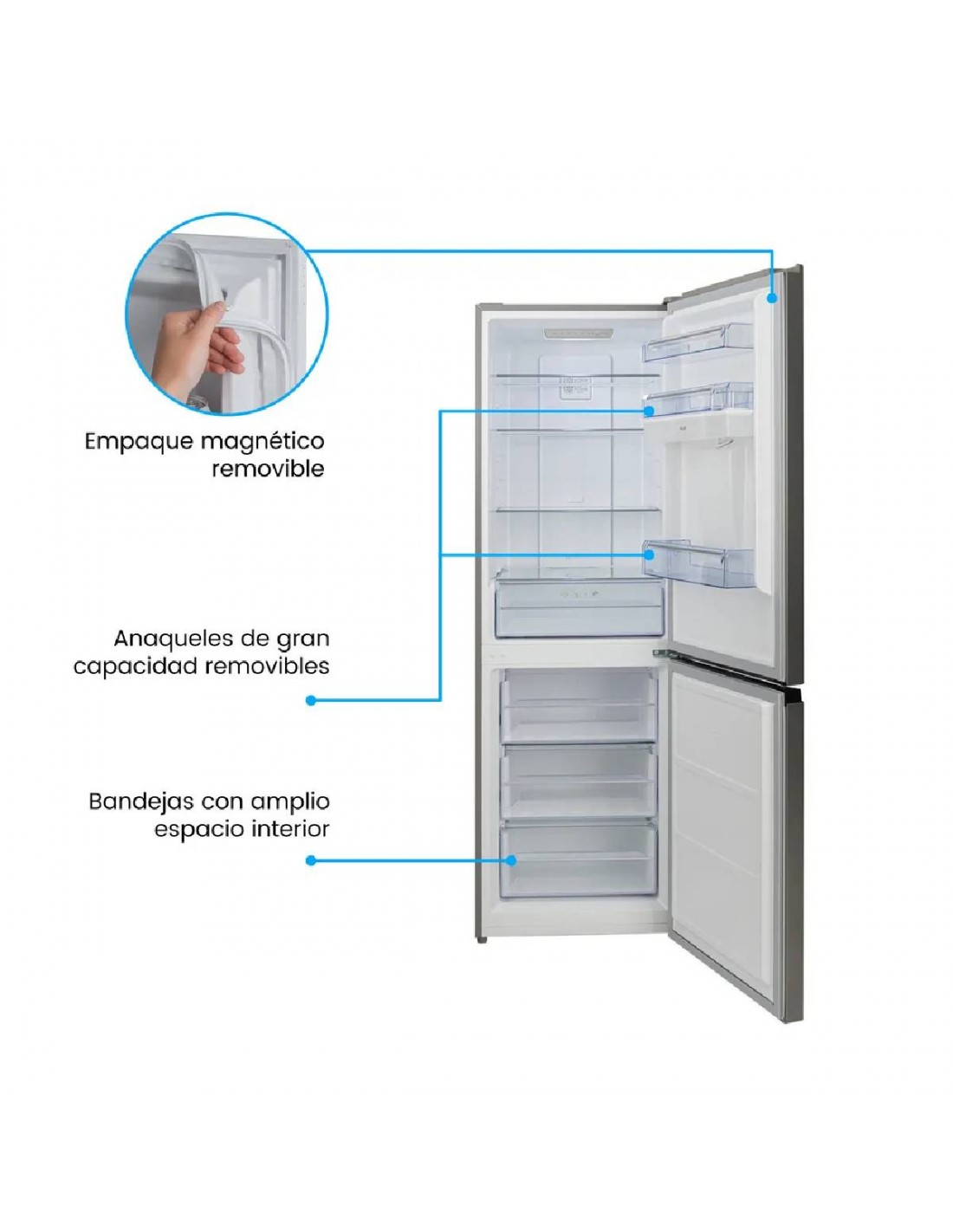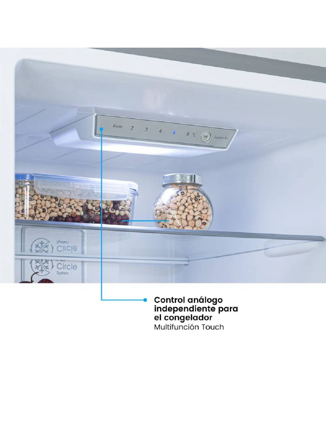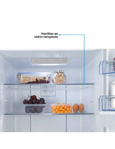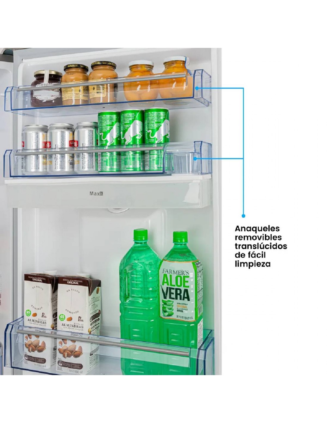 Equipada con Control Electrónico de Temperatura e indicador LED, garantiza una conservación precisa y uniforme. Su tecnología No Frost evita la formación de escarcha, manteniendo el interior limpio y optimizando el rendimiento. Además, cuenta con parrillas en vidrio templado, anaqueles removibles translúcidos y bandejas de gran capacidad que facilitan la organización.