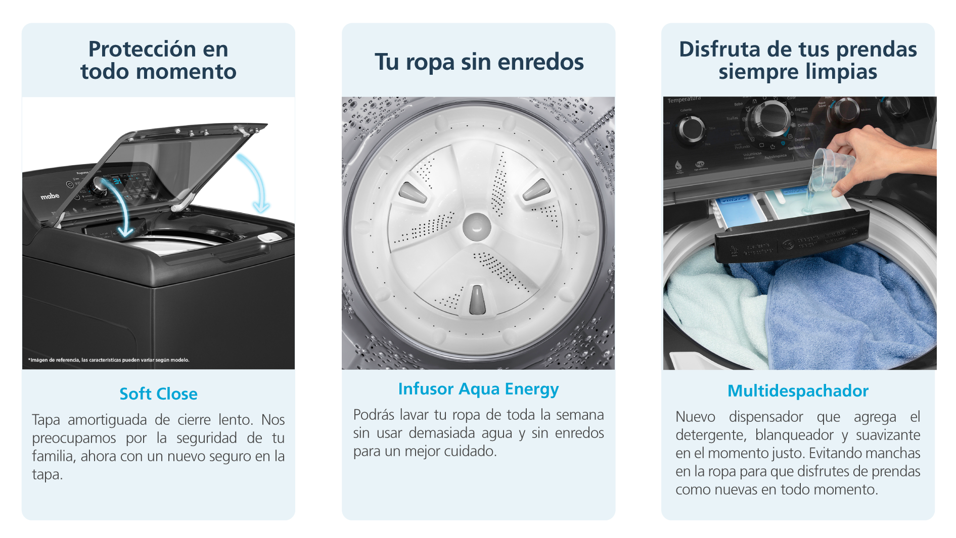 - "Tapa amortiguada de cristal con seguro - Panel con 3 perillas - Sensor de velocidad - Display táctil - Alarma de fin de ciclo - Despachador de detergente, suavizante y blanqueador"