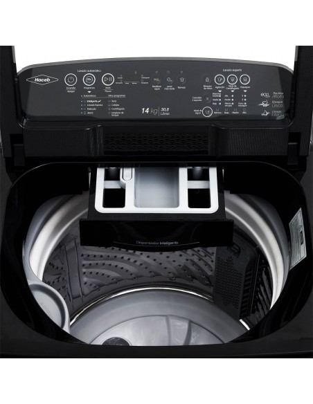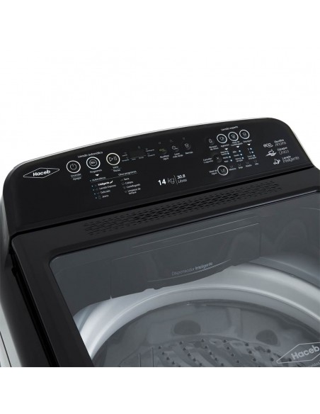 Con la Lavadora Haceb Ivy 14 Kg Carga Superior Negra| LAV IVY 14 KG D NE Optimiza el tiempo de lavado y alarga la vida de tus prendas. Cuenta con un tablero digital con tecnología que te ofrece programas y funciones especiales que se adecúan a cada tipo de prenda, además, incluye 5 programas automáticos y tecnología de lavado profundo. Posee filtración activa para reducir pelusas en tu ropa, sistema ECO para ahorrar agua y aerocentifugado para prendas más secas.