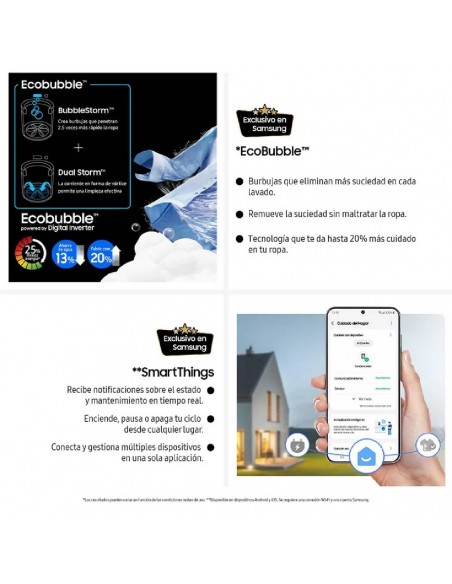 - Ecobubble - SmartThings - Magic Filter - Lavado intensivo - Vrt Plus (Tecnología de reducción de vibraciones) - Puerta de cierre suave