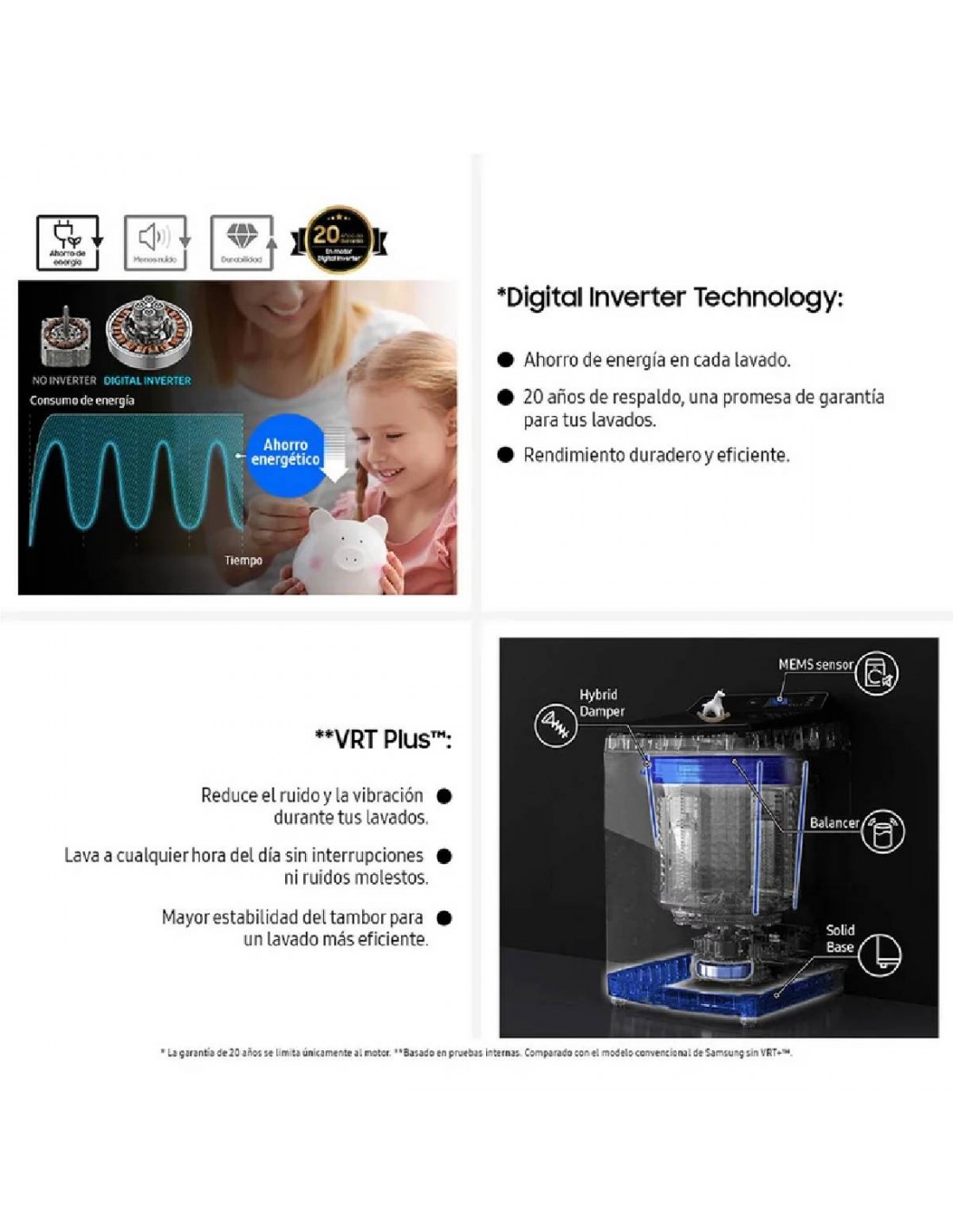 - Ecobubble - SmartThings - Magic Filter - Lavado intensivo - Vrt Plus (Tecnología de reducción de vibraciones) - Puerta de cierre suave - Lavado Rápido