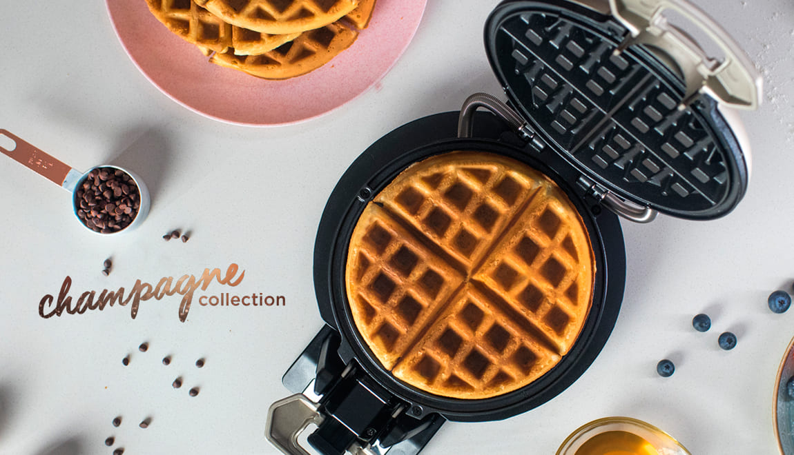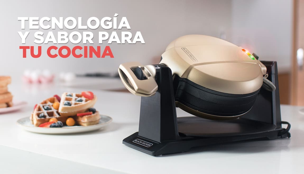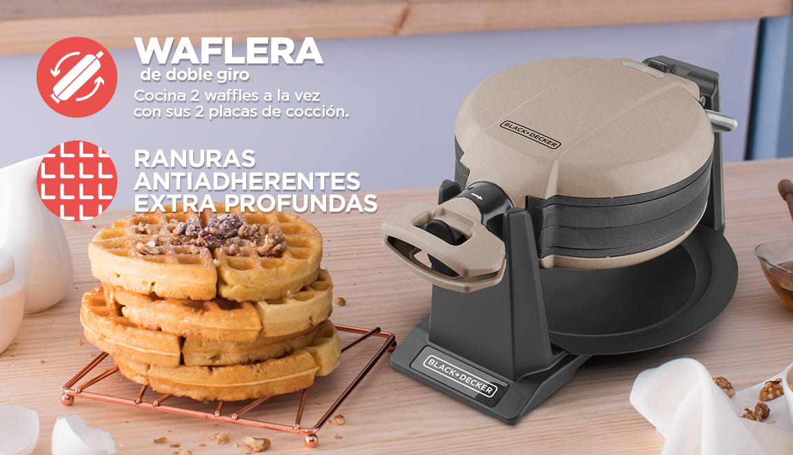 Prepara Wafles estilo Belga con la Walfera Black + Decker. Las ranuras son antiadherentes extra profundas hacen espacio para todos tus ingredientes favoritos. Controles de temperatura ajustables le permiten encontrar la mejor cocina para todos los gustos y la rotación de 180° y sistema de Coción rotativo asegura una Coción uniforme cada vez. La luces de indicador muestra cuando la unidad está conectada y cuando se haya precalentado y listo para cocinar.