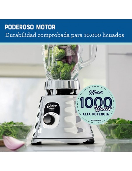 Las icónicas licuadoras Oster® son sinónimo de eficiencia y durabilidad. Y ahora, el nuevo diseño moderno de la espectacular Licuadora Clásica Oster 1.25 Lt Control de Perilla 3 Velocidades 1000 W Cromada BLST4655, reinventada y modernizada con perilla, te brinda una experiencia aún mejor.
