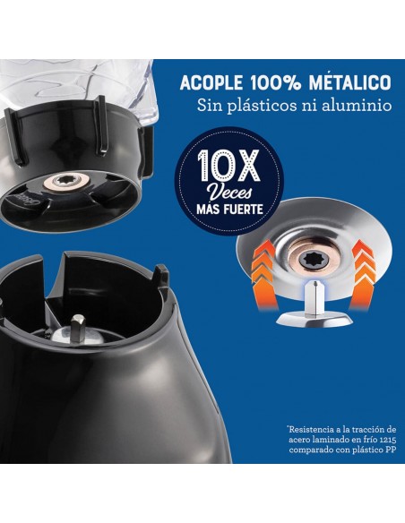 La licuadora Oster® con control de perilla y su potente motor 4 veces más duradero** con 800 W de potencia* te ayuda a preparar deliciosas y saludables recetas. Con alta fuerza de torsión, acople metálico 10 veces más fuerte***, revolucionaria cuchilla trituradora de hielo y vaso de plástico es ideal para preparar una amplia variedad de recetas frías y calientes, jugos, batidos y mucho más.