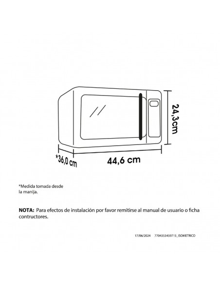 - Incluye 6 recetas (palomitas, papas, pizza, comida congelada, bebidas y calentar comida). - Ventana de visualización - Manija externa integrada - Fácil limpieza