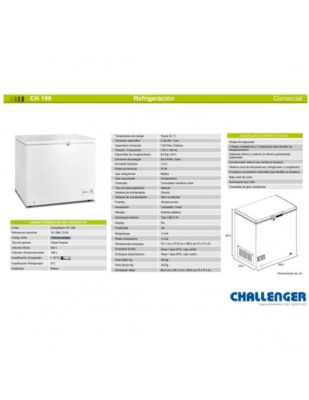 El Congelador Horizontal Challenger 204 Lt Brutos Blanco CH-199 cuenta con opciones de congelador de 0°C a -18°C y refrigerador de 1°C a 5°C, cuerpo y tanque en lámina galvanizada prepintada más resistente al óxido.