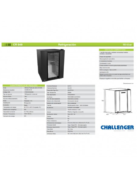 El Mini Bar Challenger 49 Litros Negro Puerta de Vidrio CR-049 combina diseño moderno y eficiencia en un formato compacto. Ideal para habitaciones, oficinas o espacios comerciales, ofrece una capacidad de 44 litros útiles y cuenta con puerta de vidrio templado, acabado negro elegante y termostato electrónico para un control preciso de temperatura (16 °C a 32 °C). Su sistema de enfriamiento por convección natural y descongelación automática mantiene tus bebidas y productos en óptimas condiciones. Incluye iluminación LED, exhibidor de botellas, manija metálica integrada, y patas niveladoras para mayor estabilidad. Funciona con gas refrigerante ecológico R600a y ciclopentano, lo que lo hace más eficiente y amigable con el medio ambiente. Compacto y funcional, es perfecto para quienes buscan estilo y practicidad.