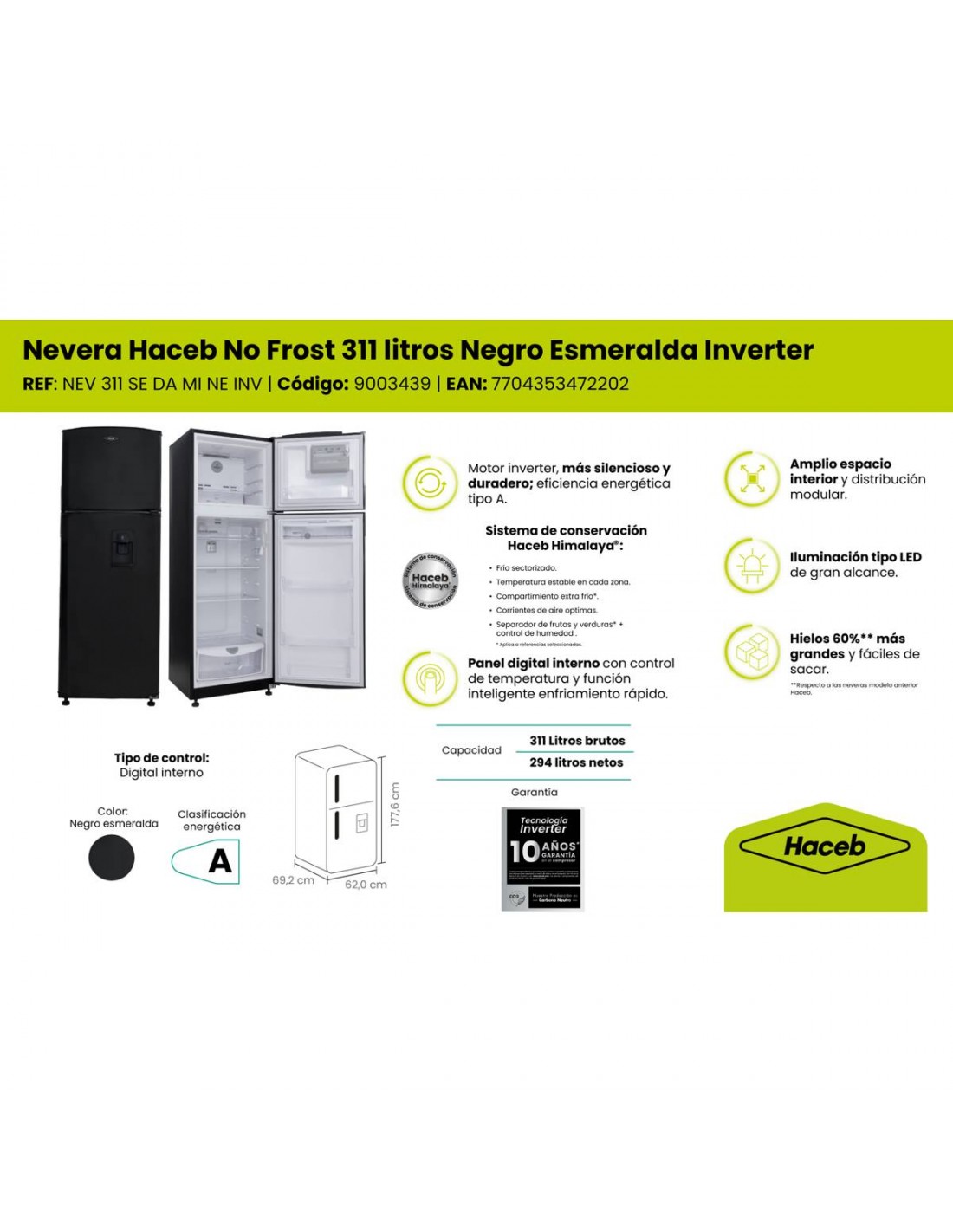 La Nevera Haceb No Frost 311 Litros Negro Esmeralda con manija integrada es la combinación perfecta entre eficiencia, diseño y conservación avanzada. Su motor inverter garantiza un funcionamiento más silencioso, duradero y con bajo consumo, logrando eficiencia energética tipo A para un ahorro real en tu hogar.