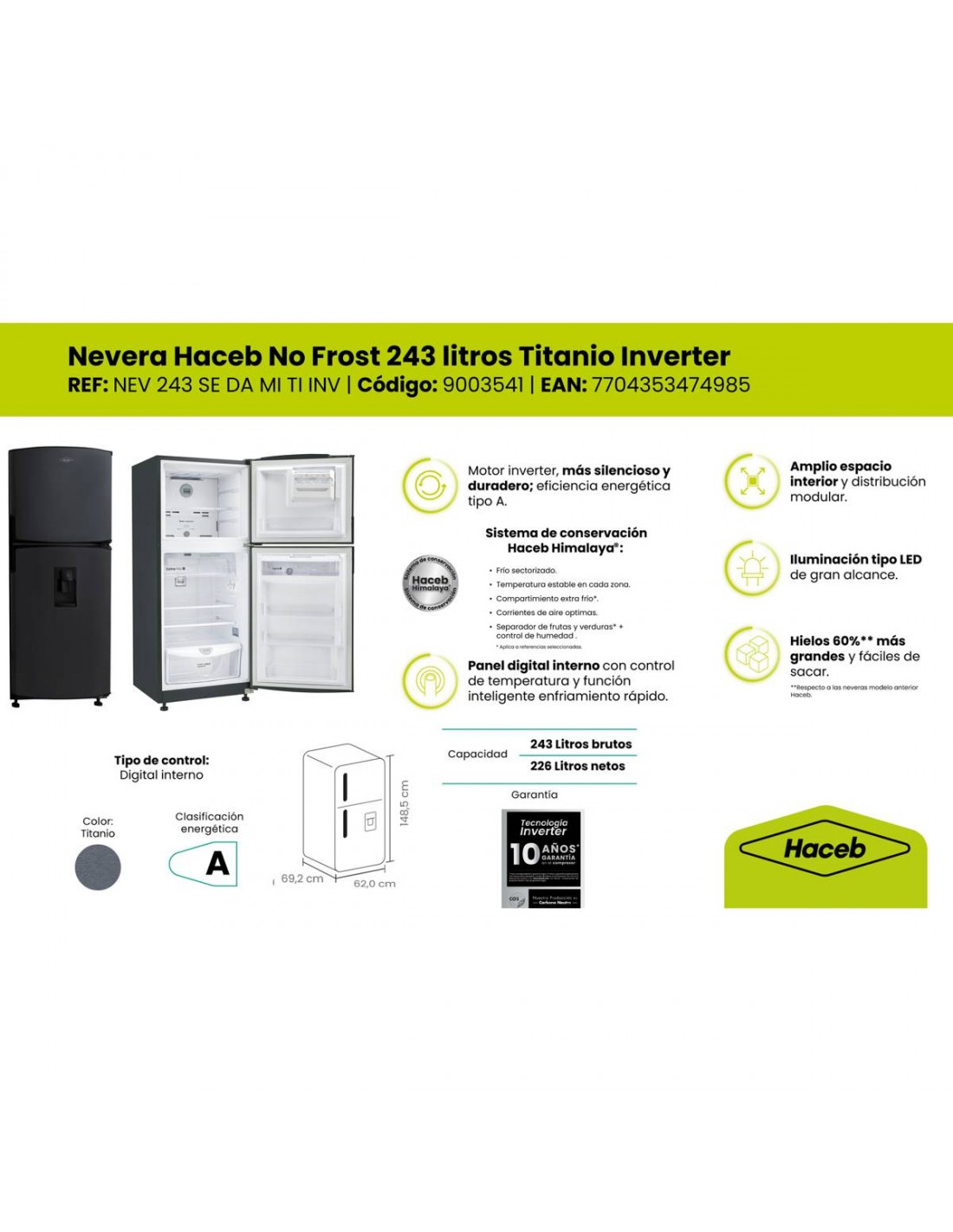 La Nevera Haceb 243 Litros No Frost Titanio Inverter NEV 243 SE DA MI TI INV ofrece eficiencia, frescura prolongada y un diseño moderno con manija integrada. Su motor Inverter y clasificación energética A permiten un funcionamiento más silencioso, mayor durabilidad y hasta 67% de ahorro energético. La tecnología No Frost garantiza refrigeración uniforme sin formación de escarcha.