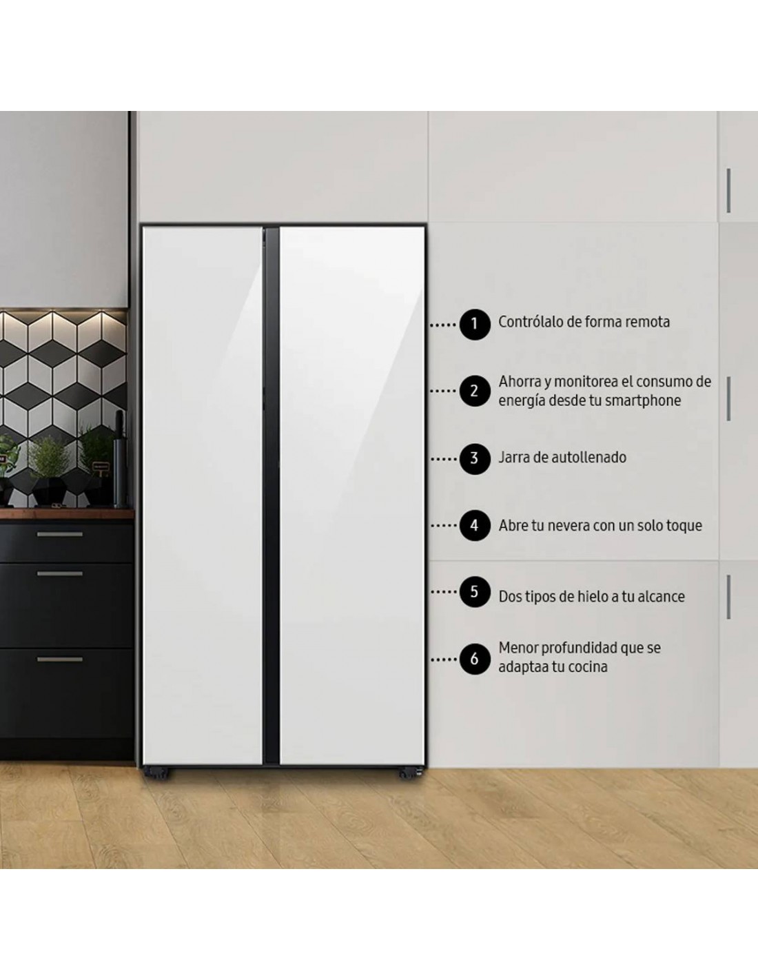 Disfruta de un diseño premium y un rendimiento superior con el Nevecon Samsung 640 L Side by Side Blanco RS23CB760A12CO, creado para ofrecer más capacidad, frescura prolongada y una experiencia totalmente intuitiva. Su puerta de apertura automática facilita el acceso con un leve toque, eliminando manijas externas y manteniendo una estética minimalista.