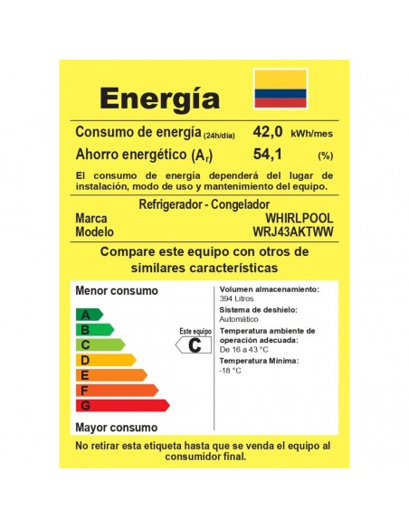 Nevera Whirlpool Top Mount 394 Lt Silver WRJ43AKTWW Xpert flow, mantiene la temperatura homogénea. Cajón con control de humedad. Anaquel con capacidad de galón. Iluminación LED. Superficie Anti finger print, no marca las huellas. Fuentes de Alimentación de Energía: Energía Eléctrica. Conectividad: Conexión con Cable. Diseño de la Nevera: Nevera Congelador Superior. No Frost.