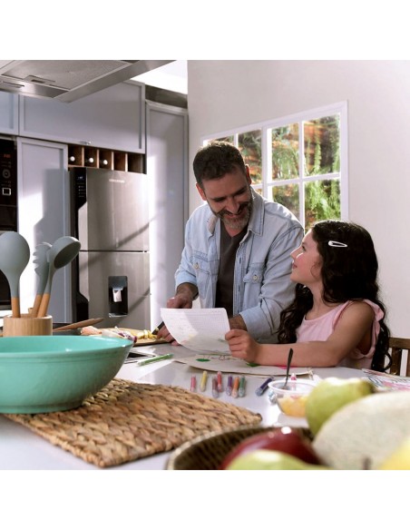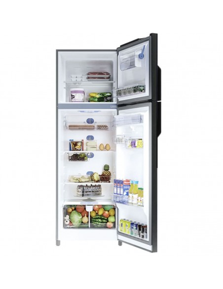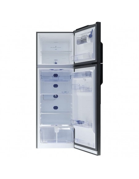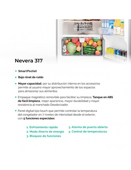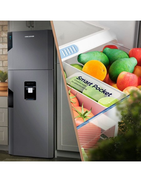 Nevera No Frost de la nueva línea de neveras Challenger Lúmina, de 317 Litros Brutos con panel digital de clase tropical de bajo ruido y de bajo consumo energético, incorpora un sistema multi flujo el cual realiza una distribución constante y uniforme de la temperatura para mantener los alimentos mas frescos con descongelación automática, cuenta con refrigerante R600a que conlleva a una mayor eficiencia energética y reduce el riesgo del impacto sobre el calentamiento global y el daño a la capa de ozono. Incluye un novedoso Smart Pocket en el compartimiento de frutas y verduras pensado para alimentos iniciados.